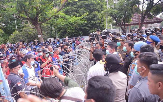 PALEMBANG, SIMBUR – Aksi unjuk rasa menolak UU Omnibus Law Cipta Kerja kembali bergulir di Palembang. Kali ini ribuan buruh yang melakukan demonstrasi di Gedung DPRD Provinsi Sumatera Selatan, Kamis (15/10).