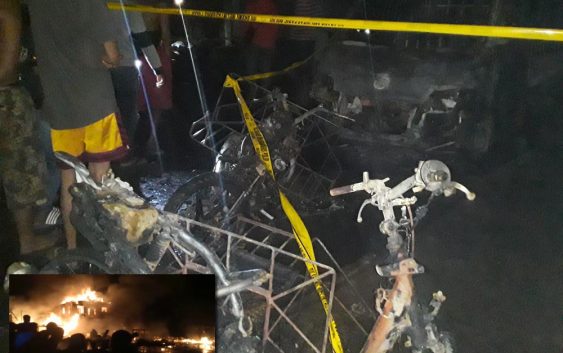 Diketahui, salah satu rumah tembok dua tingkat mentereng, berikut toko kelontongan, mobil Toyota Avanza warna putih, mobil Suzuki APV warna hitam, mobil pick up warna hitam, berikut 3 unit motor bebek, yang terbakar merupakan milik JN (50) dan YL.