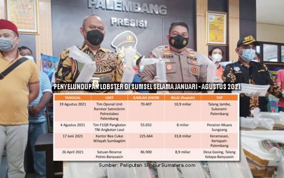 Diwartakan Simbur sebelumnya, tercatat sudah tiga kali penyelundupan benih lobster berhasil digagalkan sepanjang 2021. Pada 4 Agustus 2021, sebanyak 55 ribu ekor benih lobster senilai Rp8 miliar di perairan Muara Sungsang, Banyuasin gagal diselundupkan ke Singapura karena terendus Tim F1QR Pangkalan TNI Angkatan Laut Palembang, pada 4 Agustus 2021. Pada 17 Juni 2021, penyelundupan 225.664 ekor benih lobster jenis pasir senilai Rp33,8 miliar dengan tujuan Malaysia berhasil digagalkan Kantor Bea Cukai Wilayah Sumbagtim saat melintas di kawasan Keramasan, Kertapati Palembang. Selanjutnya, pada 26 April 2021 penyelundupan 86.900 benih lobster senilai Rp8,9 miliar diamankan Polres Banyuasin di Desa Gasing Kecamatan Talang Kelapa Kabupaten Banyuasin. (nrd)