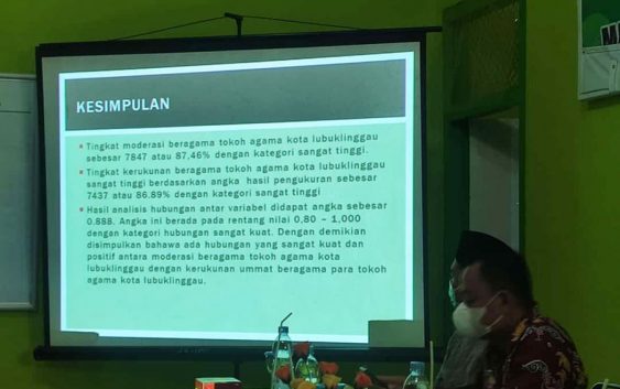 “Hasilnya mencapai indeks 86 Persen, Tingkat Moderasi Beragama di Kota Lubuklinggau Tinggi, ini menjawab klaim bahwa benar di Kota Lubuklinggau yang sangat majemuk ini Masyarakatnya rukun dan kategori Zero Konflik.” kata Ismuridjal.