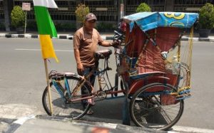 Siang itu suhu di Kota Kembang cukup terik dan menyengat. Hampir mencapai 32 derajat Celcius. Awak media ini mencoba order taksi online melalui aplikasi di smartphone. Tiba-tiba terlihat satu becak di perempatan Jl Lembong. Tampak seorang pengemudinya duduk di dalam becak. Media ini pun mengurungkan niat order taksi online lalu memilih untuk naik becak.