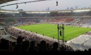 Tidak ada satu pun orang pun yang menginjak-injak rumput Stadion Utama Gelora Bung Karno, Jakarta Pusat, selama misa suci yang dipimpin Paus Fransiskus, Kamis (5/9). Rumput lapangan sepak bola yang akan dipergunakan untuk menghadapi Australia pada putaran ketiga kualifikasi Piala Dunia, Selasa (10/9), tidak digunakan selama perayaan misa.