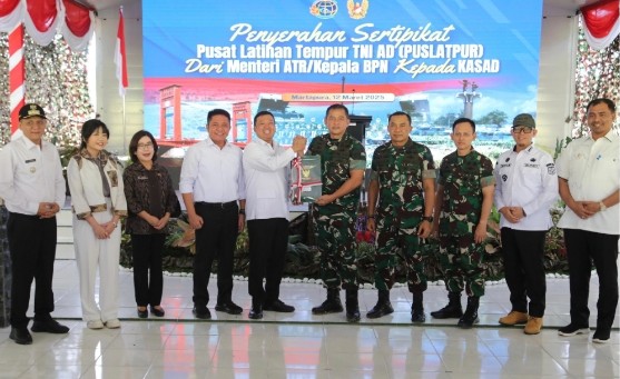 MARTAPURA, SIMBUR – Pusat Latihan Tempur (Puslatpur) TNI AD di Martapura Kabupaten OKU Timur resmi bersertifikat. Hal itu menambah kepastian hukum aset milik TNI AD. Sertifikat langsung diserahkan Menteri ATR/Kepala BPN Nusron Wahid kepada Kepala Staf TNI Angkatan Darat (KSAD) Jenderal TNI Maruli Simanjuntak, M.Sc. Penyerahan sertifikat berlangsung di Puslatpur Martapura Kabupaten OKU Timur, Rabu (12/3) siang.