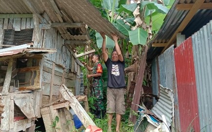 Kegiatan dimulai dengan aksi bersih-bersih di rumah-rumah yang terkena dampak longsor. Babinsa bersama masyarakat setempat bergotong royong membersihkan puing-puing dan material longsoran yang menimpa rumah-rumah warga.